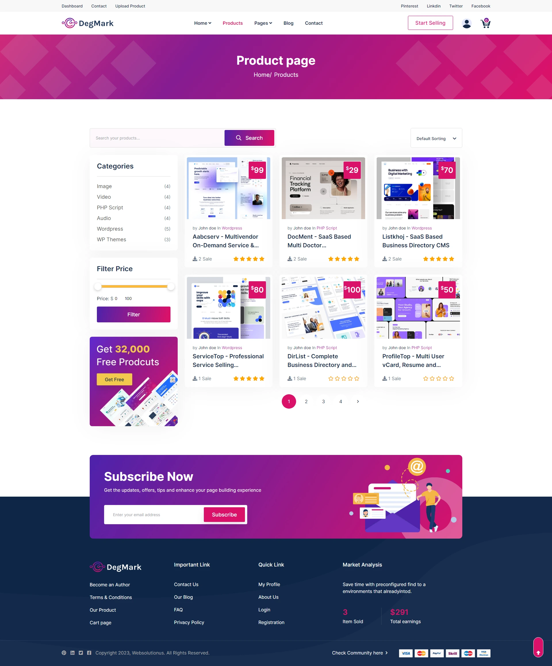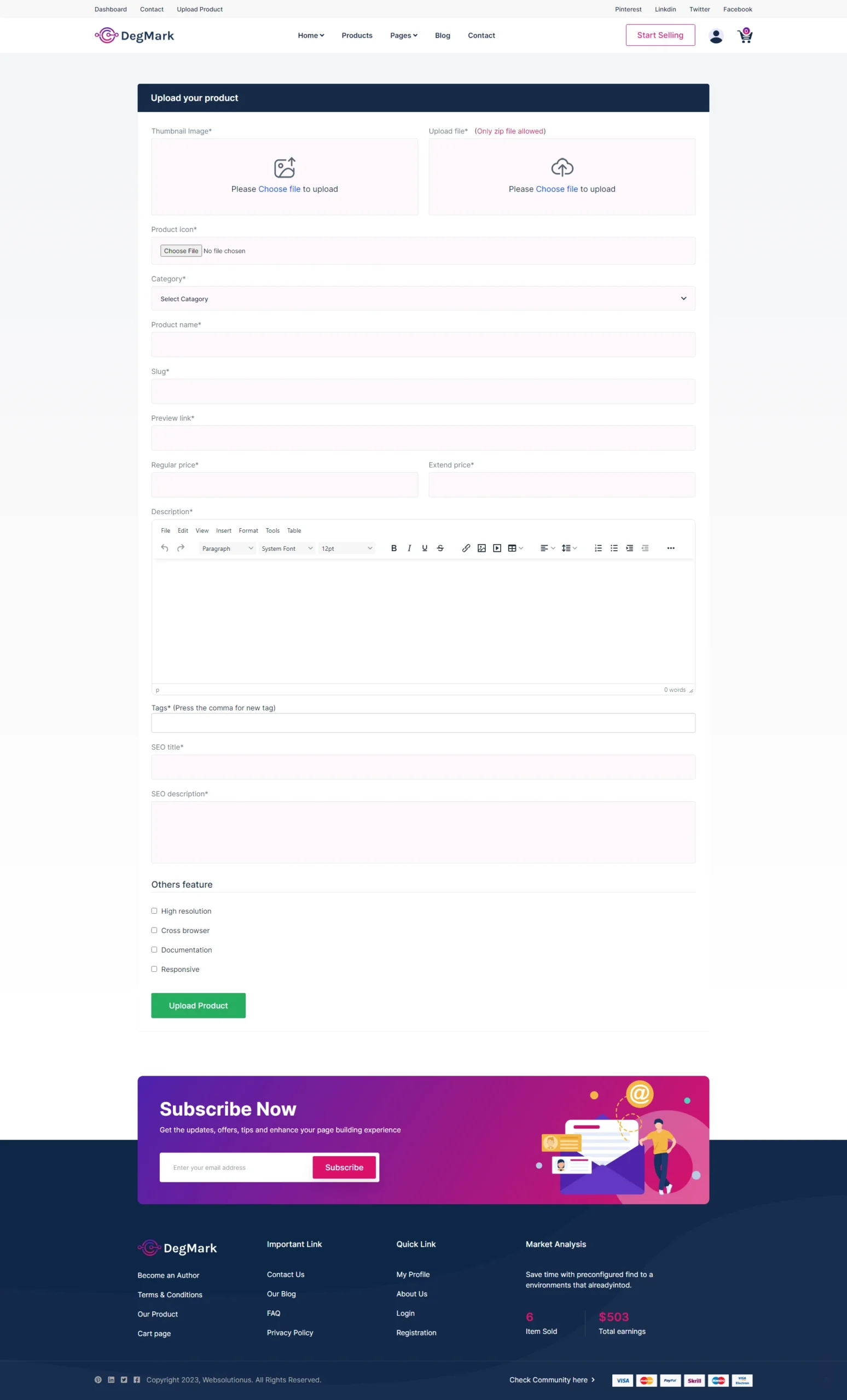 With support for digital items such as scripts, themes, plugins, apps, audio, video, graphics, software, and more, you can monetize your content or empower other vendors to sell on your platform. DegMark features a stunning, fully responsive design powered by Bootstrap 5, and includes robust admin controls, multi-language and RTL support, built-in SEO settings, secure login options, and several payment gateways.
